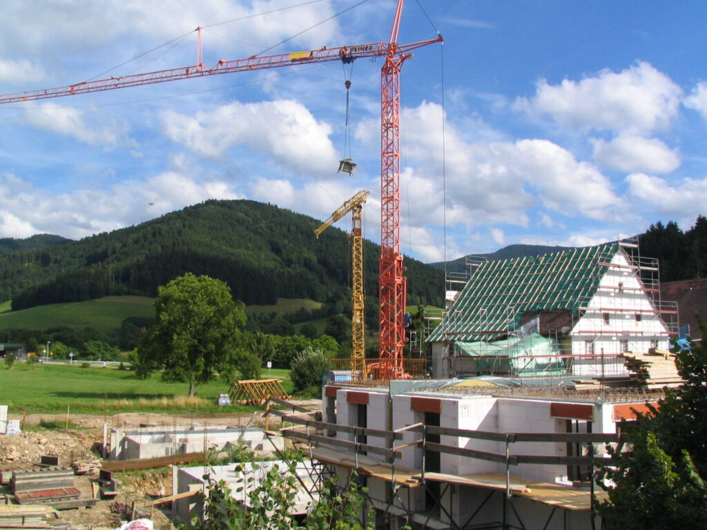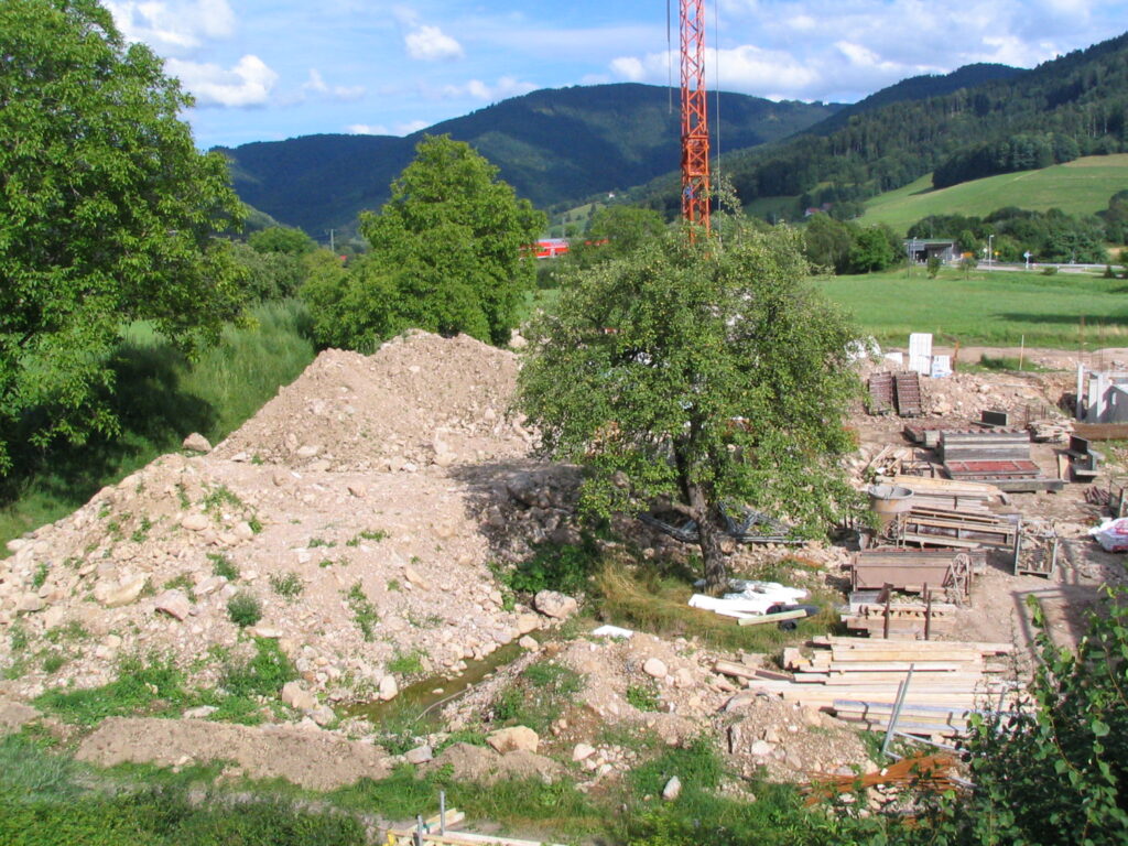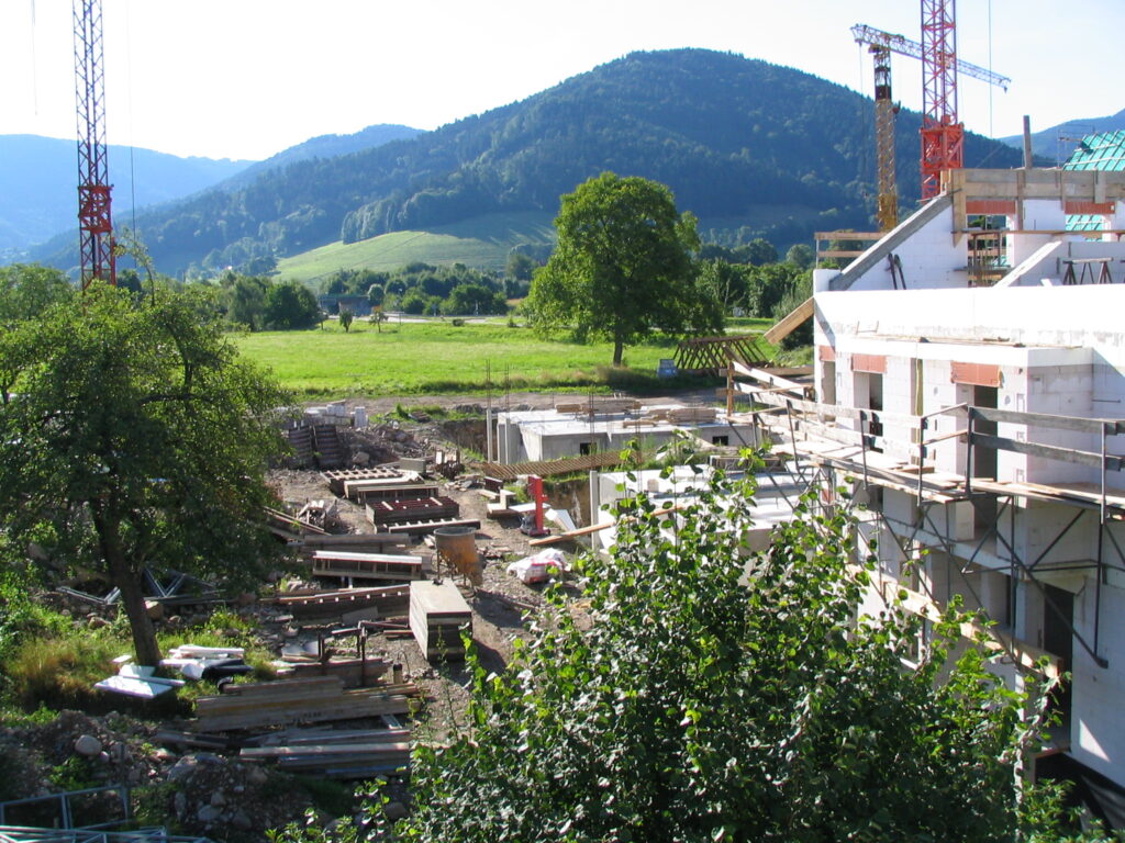 Baukräne statt Erholungslandschaft in der Urlaubsdestination Kirchzarten. Anblick beim Bau der Kirschner-Wohnbebauung auf der Rainhofwiese im Jahr 2008Flächenfraß auf der Rainhofwiese. Auch der letzte Teil der Freifläche mit ökologischer Bedeutung für den Klima-, Boden- und Artenschutz soll der Bebauung geopfert werdenErdaushubdeponie auf der Rainhofwiese im Jahr 2008. Wenn die neue Bebauungsplanung Wirklichkeit wird, werden die wertvollen Baumbestände der Streuobstwiese der Axt zum Opfer fallen